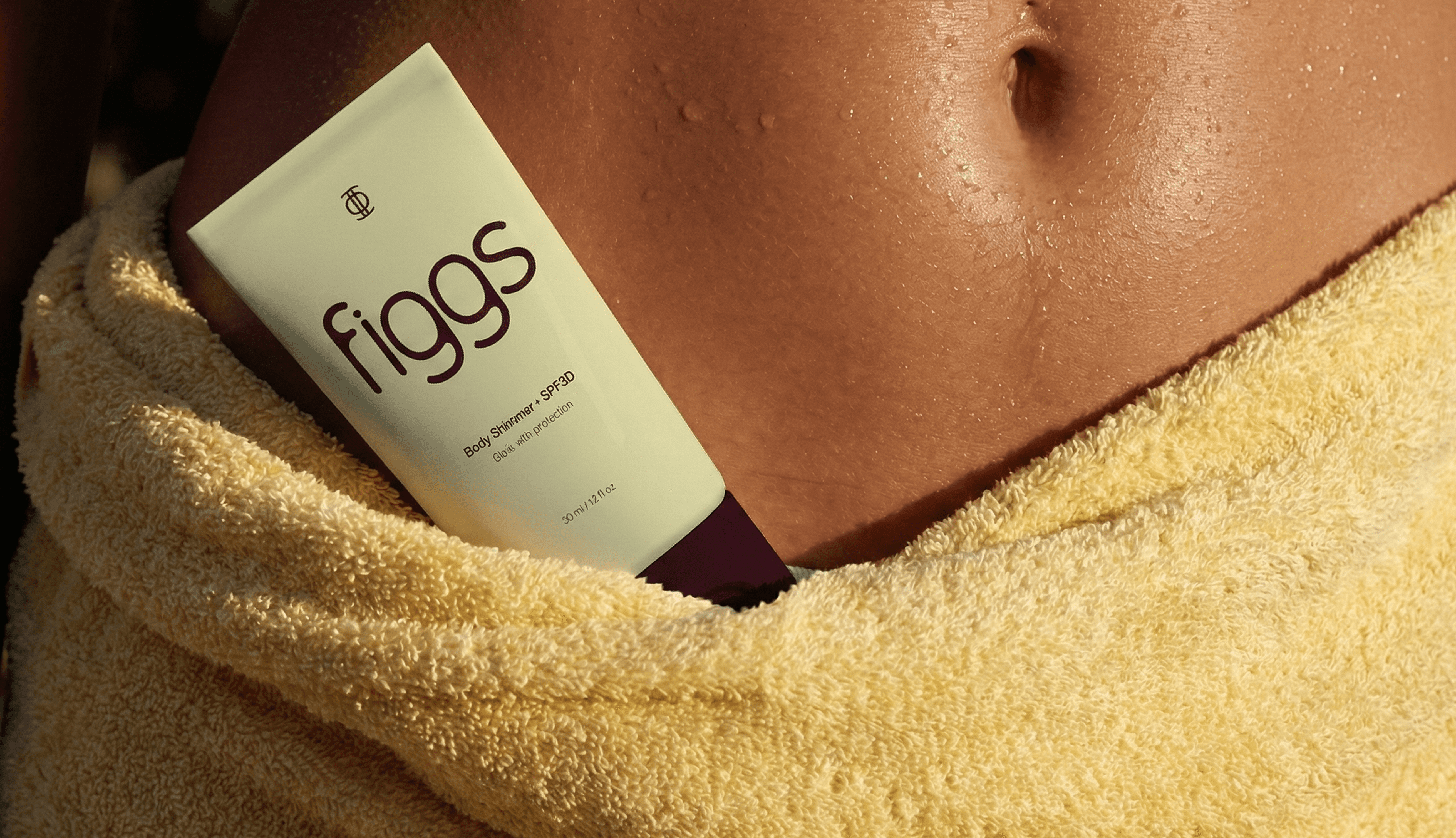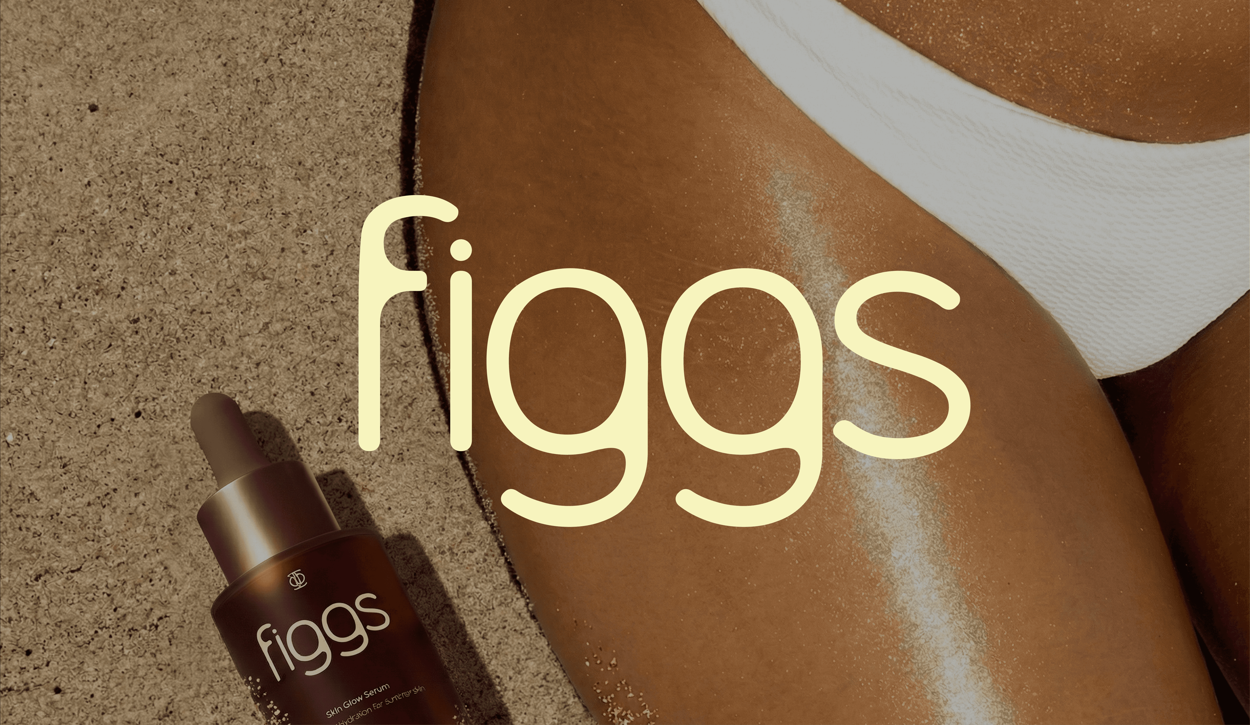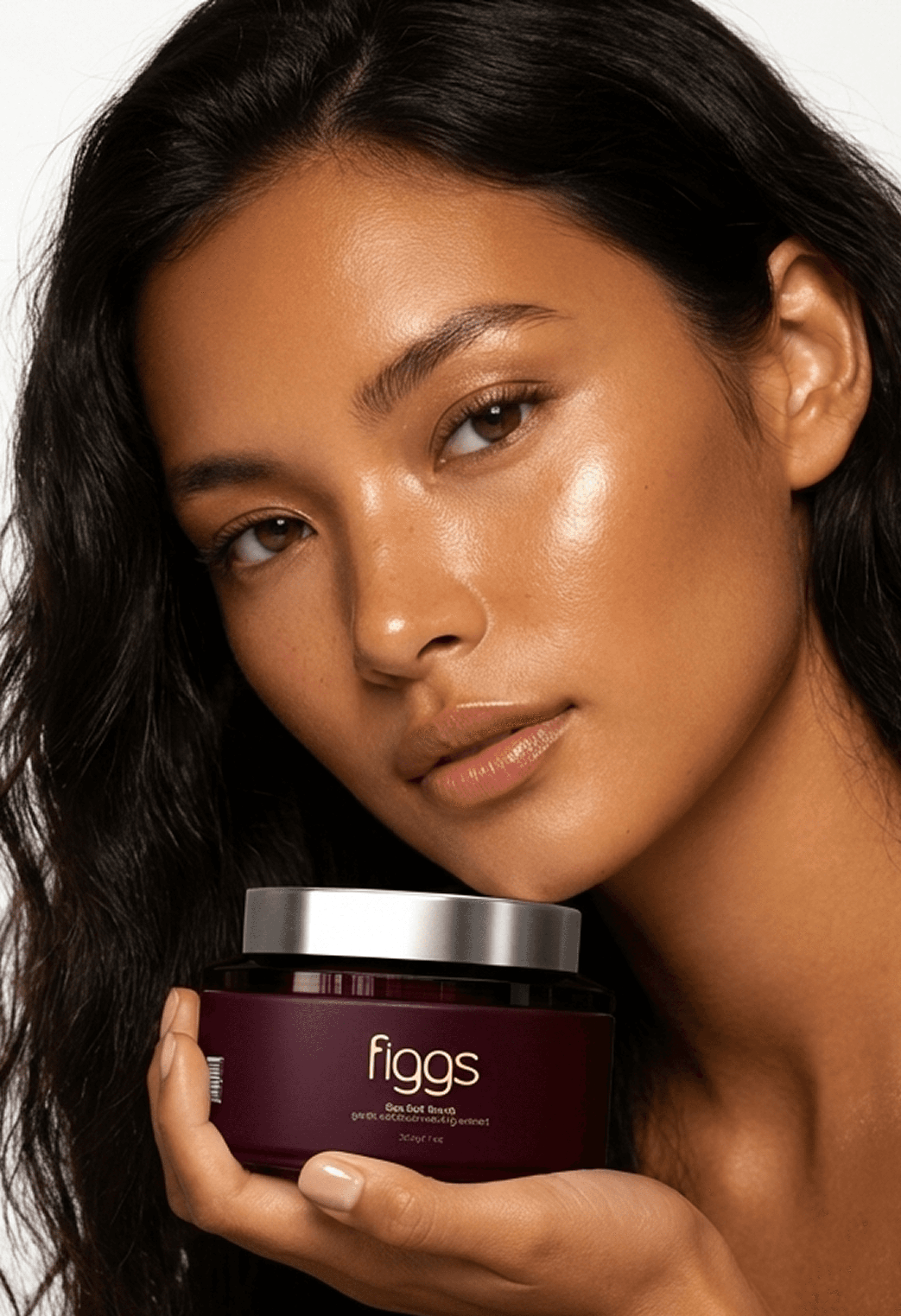 The Figgs brand identity is built around a warm, sun-drenched palette of deep fig tones, soft golds, and earthy neutrals, paired with glossy skin imagery and clean typography to create a sensual, summer-focused skincare brand positioned around glow, hydration, and effortless radiance.