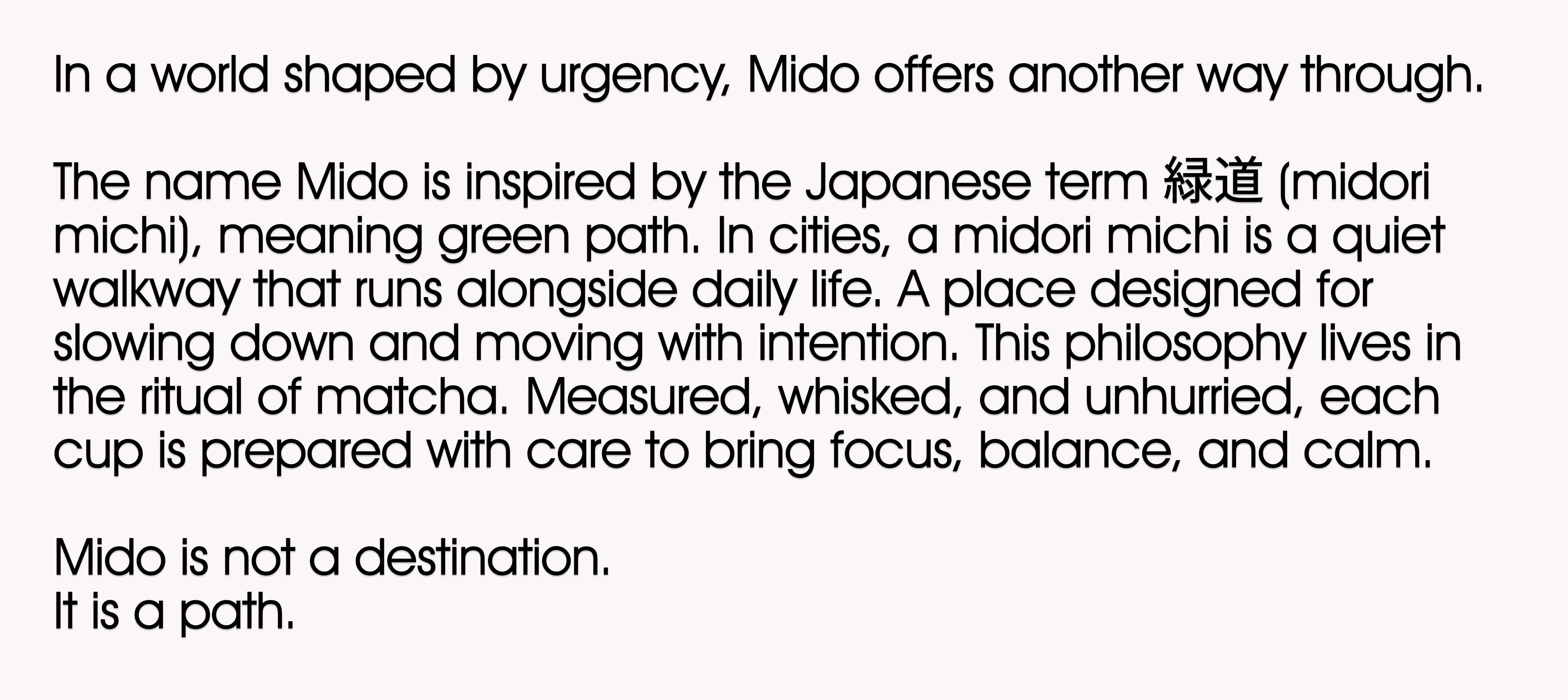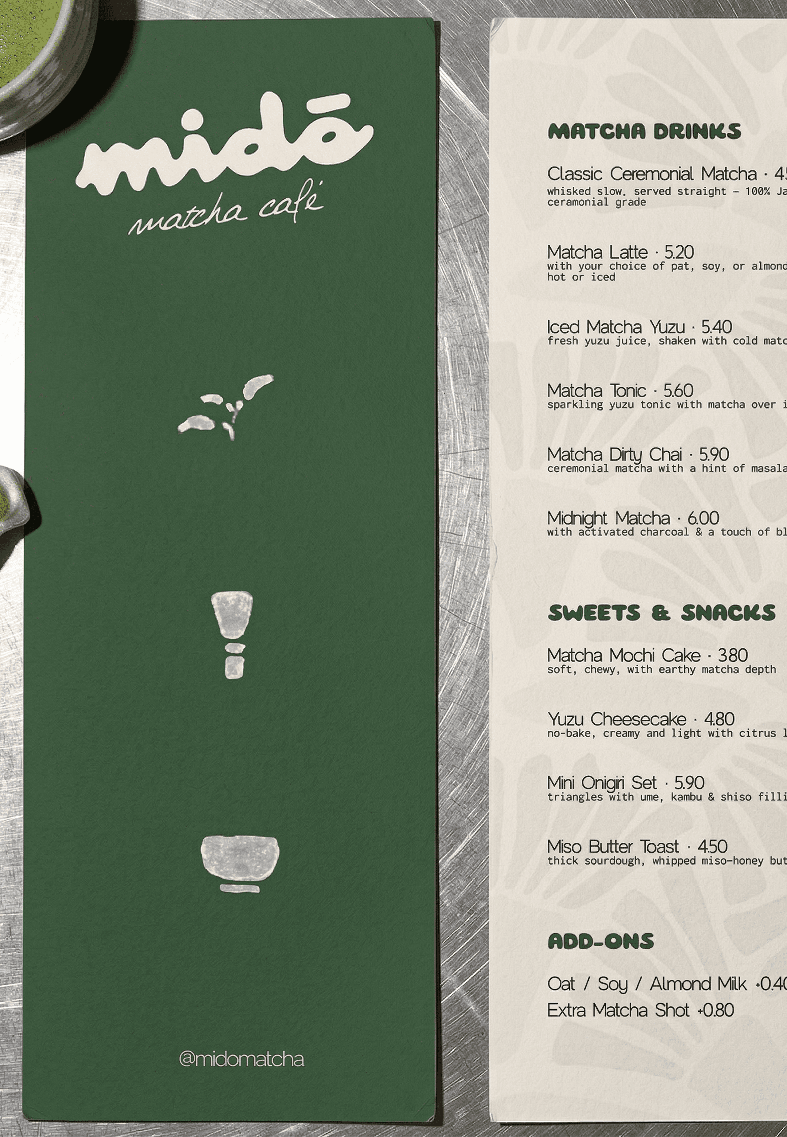 MIDŌ is a modern matcha café brand rooted in ritual and slowness, expressed through soft forms, tactile textures, and a quietly playful visual language.